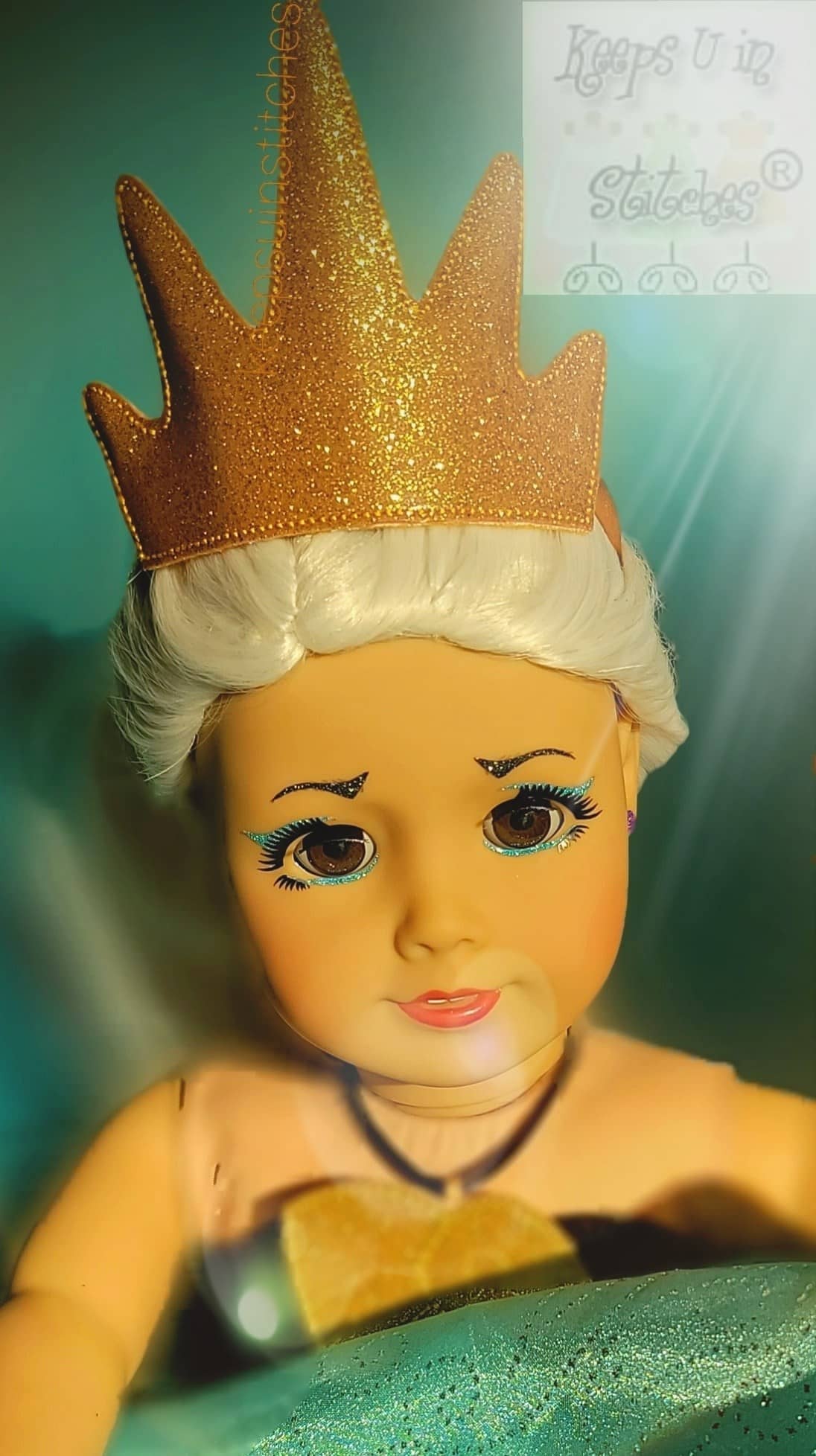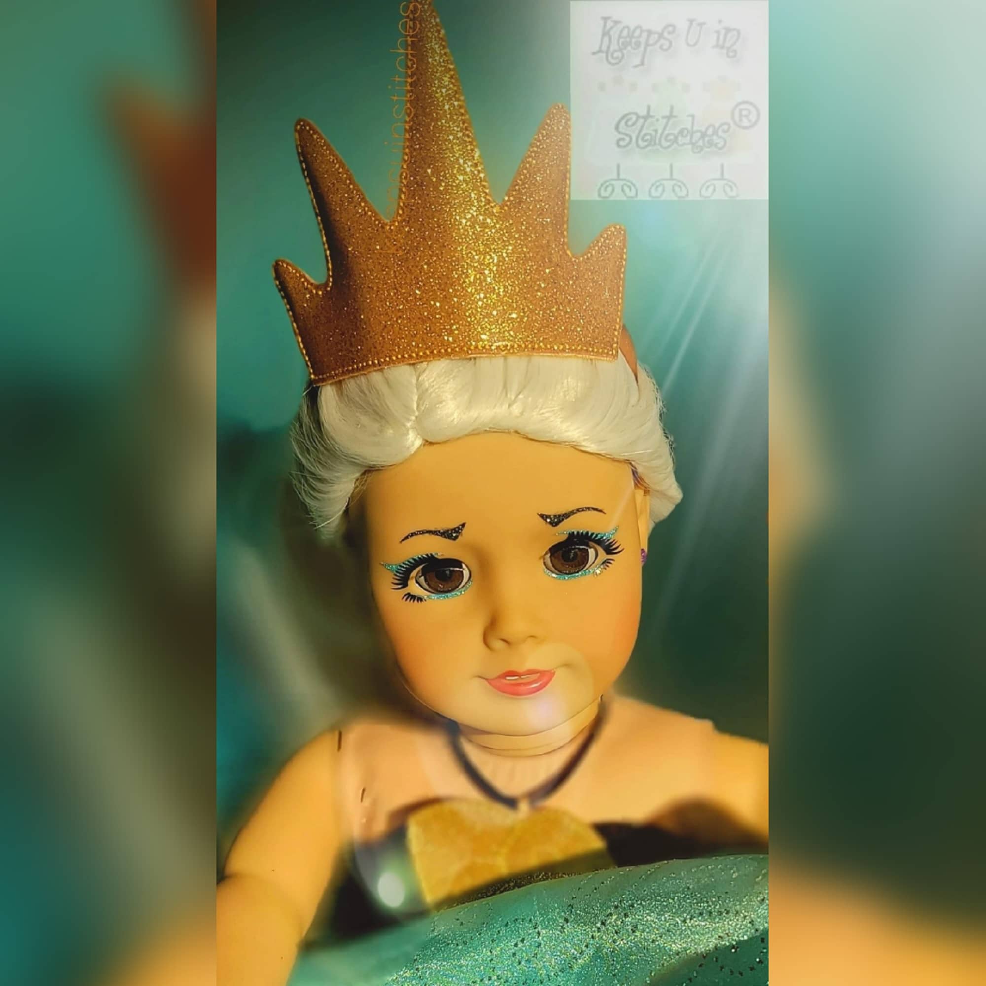 Whether looking for your poor little, poopsies, or tricking some poor unfortunate soul, or even while stealing some innocent little mermaid’s beautiful voice and stashing it away in your gold conch seashell, your doll will look at her very villainous best, while wearing one of our wicked crowns! Please welcome Keeps U in Stitches® most recent addition to our New “COLLECTION” of Tiaras and Crowns…Inspired by the all-time favorite Hans Christian Andersen’s classic story, The Little Mermaid! These pieces will be custom created for you, delicately stitched in the highest quality gold glitter vinyl available on the market, along with our high quality, soft, coordinating “Exclusive” Vintage Gold felt backing. Our crown features our coordinating headband, which is an exclusive 7mm plastic headband covered in our thick luxurious coordinating “Exclusive” Vintage Gold satin. Our Doll Trident will ship boxed, and the fork head permanently attached to a hand painted golden acrylic wooden dowel, with a finished length of approx. 16″ long, which has been sized to fit our Doll Crown p-e-r-f-e-c-t-l-y! Our conch shell necklace is created with a simple golden lobster claw clasp and “O-ring” attached to a high quality black silk cording. Again, your SET will be shipped box, completely assembled and ready to display on your 18″ little friend. You can store or pack your crown semi-flat for travel, by simply disassembling and reassembling your crown, by sliding the headband through the appropriate openings in the crown. (ONE Crown, ONE Trident, ONE Conch Shell Necklace for an 18″ Doll is Included in this Listing, ONLY! Doll, Wig and all other costumes, accessories and items are for photo purposes, ONLY and are NOT included! Most ALL of our CROWNS ARE AVAILABLE for separate purchase in DOLL, INFANT/TODDLER, CHILD, & TEEN/ADULT SIZE upon request!)